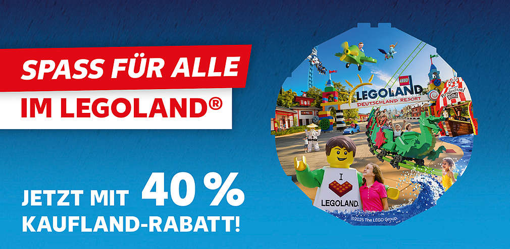 Spare jetzt mit Kaufland satte 40 Prozent beim Kauf von bis zu 5 Tagestickets für das LEGOLAND® Deutschland Resort! Die Rabatt-Gutscheine sind bis 13. Dezember 2025¹ an unseren Kaufland- Kassen erhältlich.