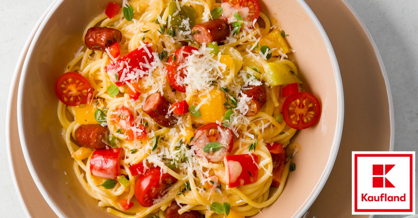 Hier bekommst du ein Rezept, das ein echtes Umami-Highlight ist. Denn zur Pasta gesellen sich Paprika, Wurst, Sahne, frische Kräuter und eine kleine Portion Parmesan. Das Tolle daran ist, dass du die Pasta und die geschnippelten festen Zutaten lediglich mit der Sahne und einer ordentlichen Ladung Wasser solange im Topf garen musst, bis die Nudeln bissfest sind. Bei den Zutaten kannst du natürlich nach Lust und Laune variieren, sobald du den Dreh raus hast. Statt Cabanossi kannst du zum Beispiel auch auf fleischlose Alternativen wie Tofu oder Pilze ausweichen. Statt Sahne kommt genauso gut Kokosnussmilch infrage. Probier es aus!
