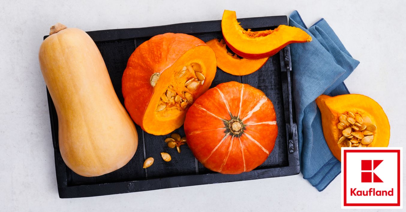 Kürbis ist die Frucht der Kürbispflanze. Der Name leitet sich vom lateinischen corbis, also Korb beziehungsweise Gefäß, ab. Insgesamt gibt es rund 800 Kürbissorten, etwa 200 davon können in der Küche verwendet werden. Die wohl bekannteste Sorte ist der Hokkaido, mittlerweile sind aber auch Butternut-, Muskat- und Spaghettikürbis vielen Menschen ein Begriff. Das Aussehen der Kürbisse kann sich stark unterscheiden. Das Farbspektrum reicht von Orange über Gelb bis hin zu Grün oder sogar Schwarz. Gleiches gilt für die Form: Während der Hokkaido rund ist, sind andere Sorten birnenförmig, flach oder oval.