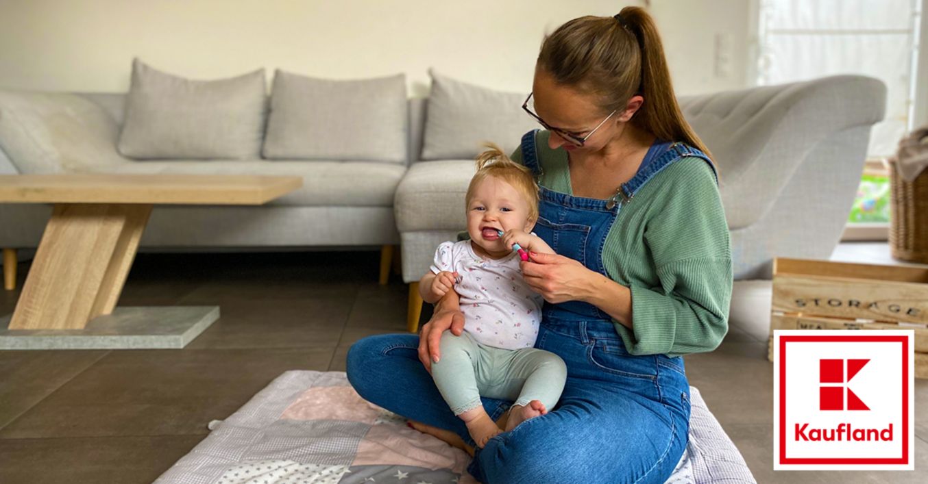 - Zahnbürste: Welche Zahnbürste du am besten für deinen Nachwuchs verwenden solltest, kommt auf das Alter und die Anzahl der Zähne an. Wenn die ersten Zahnspitzen langsam durchkommen, kannst du zunächst ein Tuch oder ein angefeuchtetes Wattestäbchen nutzen, um die Zähne zu reinigen. Alternativ gibt es in Drogerien, Apotheken und bei Kaufland spezielle Fingerzahnbürsten zu kaufen. Fahre damit über den neuen Zahn und massiere auch das Zahnfleisch deines Kindes. Wenn die Milchzähne durchgebrochen sind, kannst du auf eine spezielle Babyzahnbürste umsteigen. Ihre Besonderheit ist, dass sie mit einem extra kleinen Bürstenkopf, weichen, abgerundeten Borsten sowie einem rutschfesten Griff ausgestattet ist. So passt sie perfekt in den kleinen Kindermund und greift nicht das noch sehr empfindliche Zahnfleisch an. Zudem kann dein Baby die Zahnbürste so zumindest spielerisch auch selbst greifen und halten.