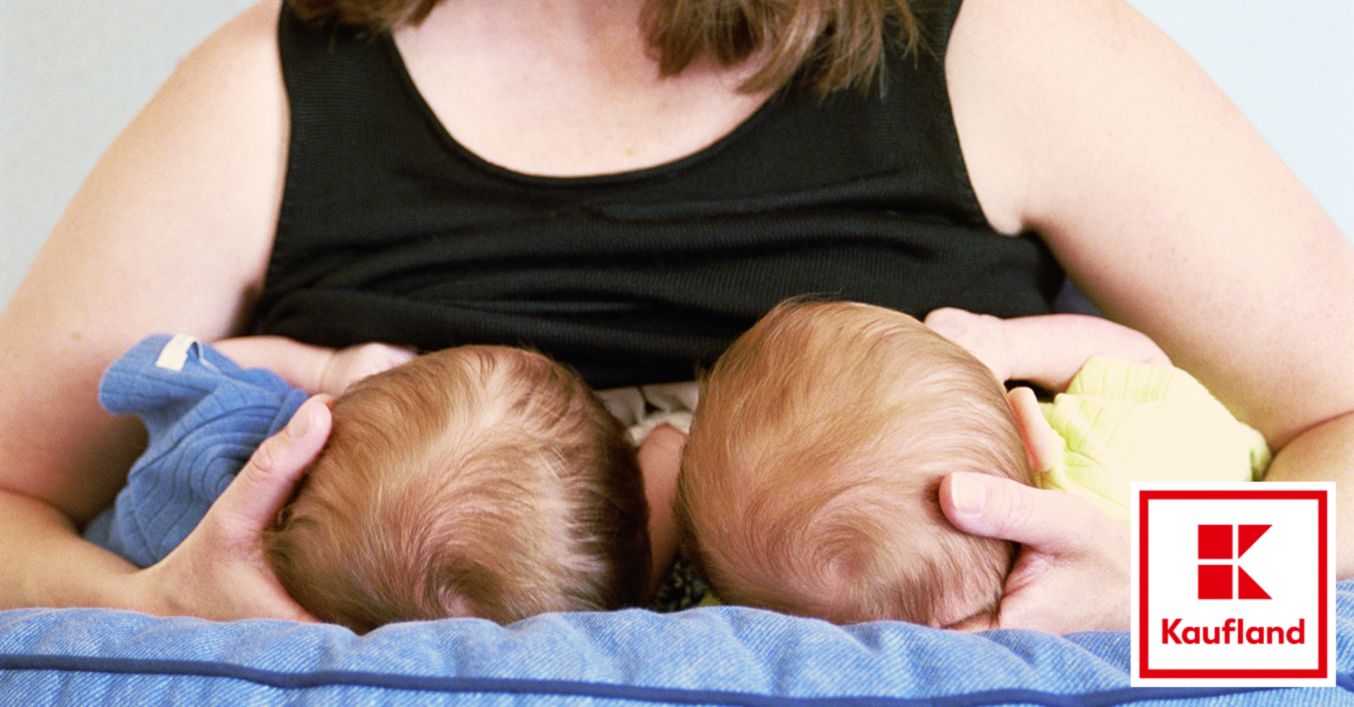 Für diese Variante kombinierst du zwei Stillpositionen. Beide Kinder können in dieser Haltung gut gleichzeitig trinken.