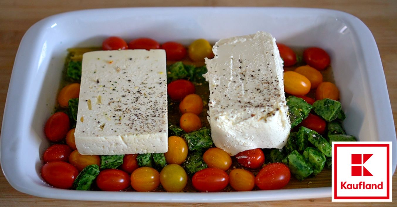 - Gib die Spaghetti, die Tomaten und den tiefgekühlten Spinat in die Auflaufform. Anschließend folgen Frisch- und Hirtenkäse.