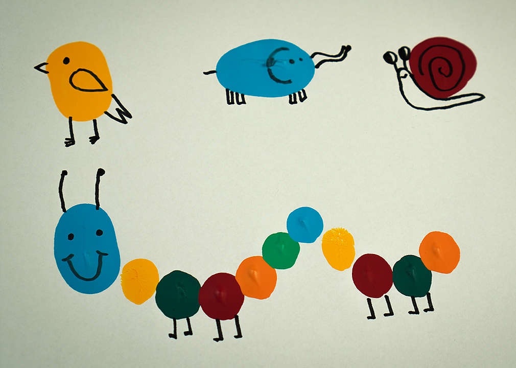 - Wähle ein Tier aus und überlege, wie dieses mit Fingerabdrücken dargestellt werden kann. Reicht ein Abdruck, zum Beispiel für einen Vogel, oder brauchst du mehrere für eine Raupe?
