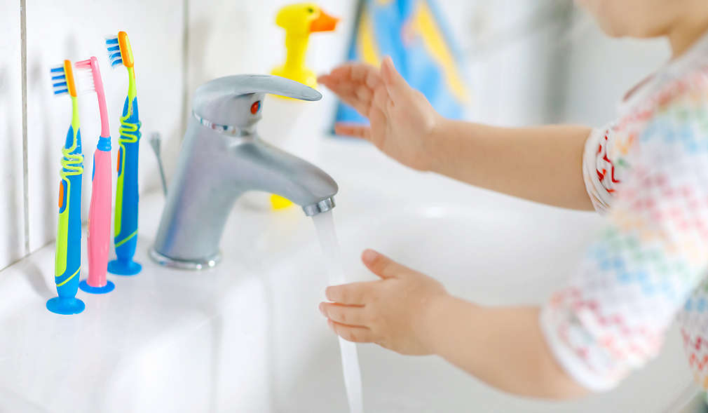 Zum Toilettengang gehört immer das anschließende Händewaschen. Versuche, es von Anfang an zur Routine werden zu lassen. Ein kleiner Hocker, der neben dem Waschbecken steht, ermöglicht es den Kleinen, eigenständig ans Waschbecken zu gelangen und sich gründlich die Hände zu waschen. Erkläre, warum dies nach dem Toilettengang so wichtig ist. Mit der Zeit verinnerlichen die Kinder den Ablauf und der Schritt von der Toilette zum Waschbecken erfolgt automatisch.