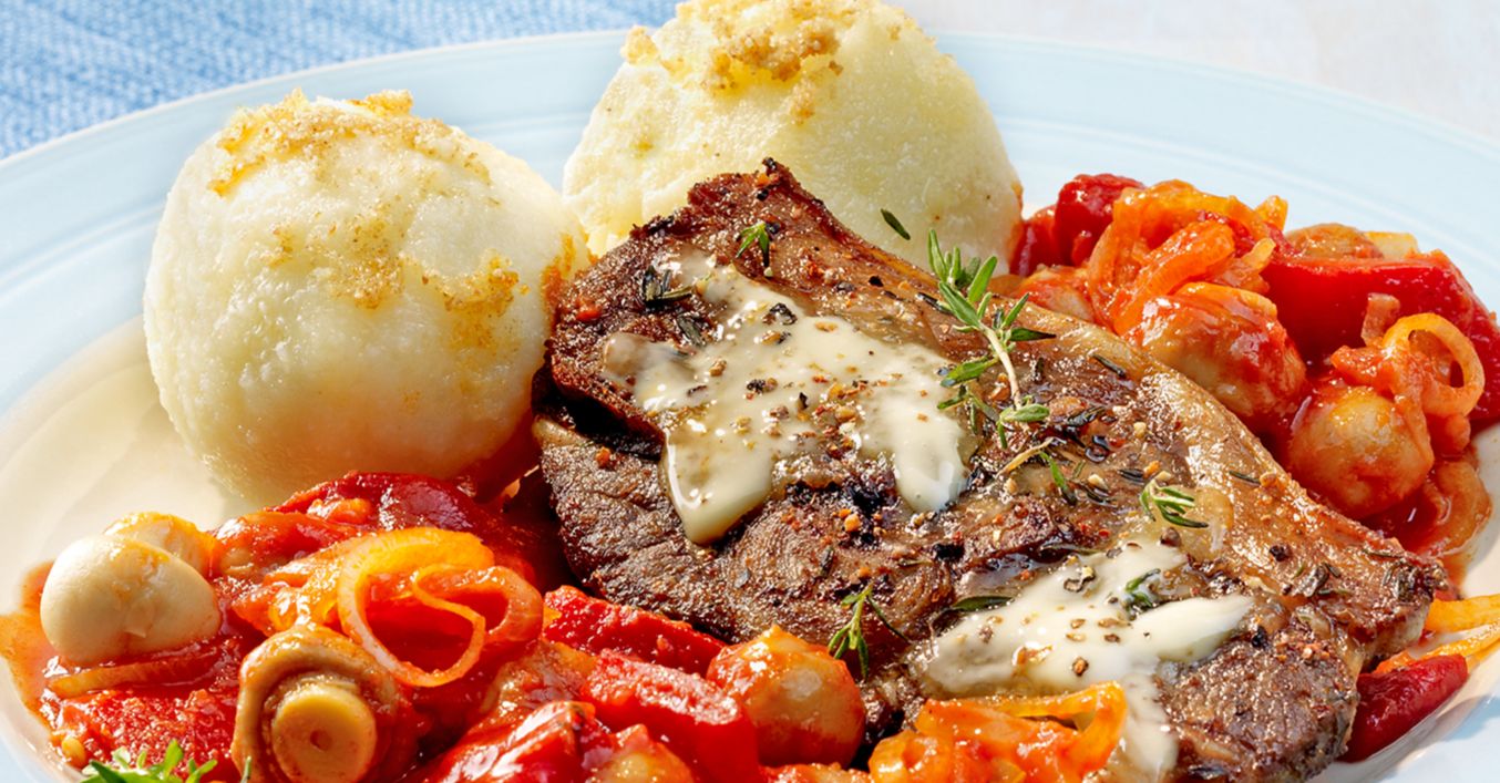 Allgäuer Lammkoteletts mit Tomaten-Paprikasoße und Knödeln