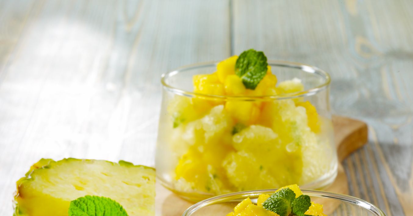 Ananasfruchtfleisch in Stücke schneiden. Granita in vorgekühlte Gläser füllen und mit Ananasstücken und nach Wunsch mit Minzblättern anrichten und servieren.