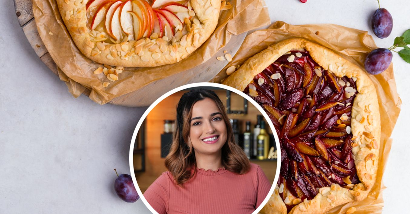 Die Ränder der Galette vorsichtig einklappen und mit gehobelten Mandeln garnieren. Galette im vorgeheizten Backofen für 40 Minuten backen.
