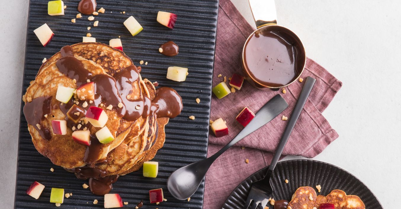 Die warmen Pancakes zu einem Turm stapeln. Mit Apfelschnitzen garnieren, mit Schokokaramellsoße übergießen und mit Haselnusskrokant bestreut servieren.