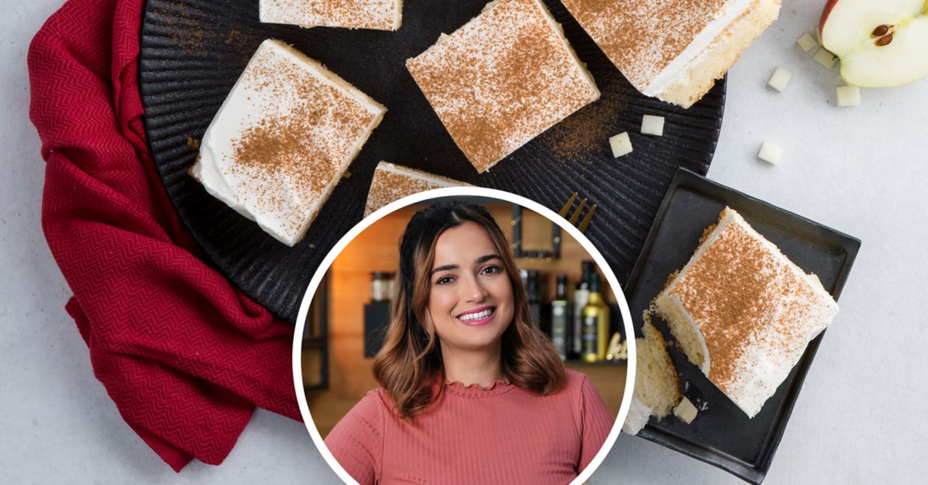 Teig in den Backrahmen füllen und glatt verstreichen. Die kleingeschnittenen Äpfel auf der Teigoberfläche verteilen und Kuchen für 26 bis 28 Minuten backen. Im Anschluss vollständig auskühlen lassen.