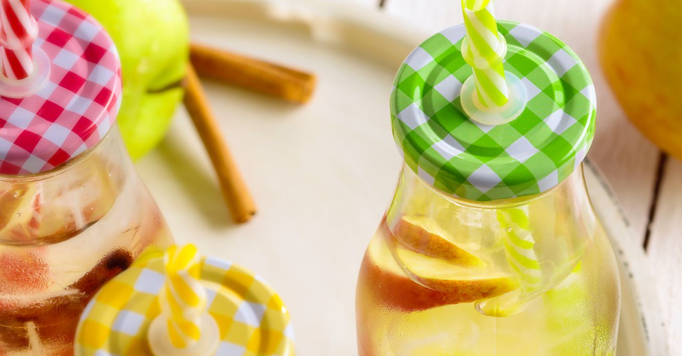 Zimtstange und Apfelspalten zusammen mit 1 Liter gut gekühltem Wasser und Eiswürfeln in eine große Karaffe oder Schraubglas füllen.