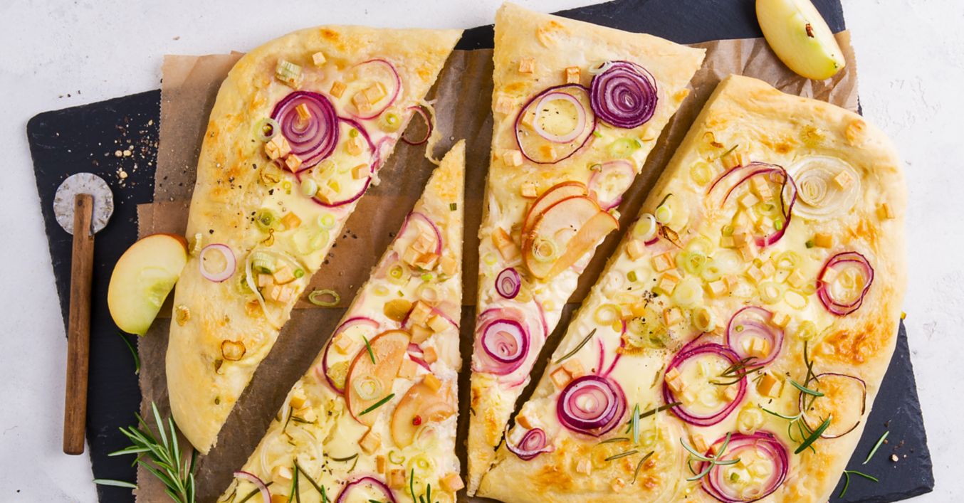 Pflanzencreme in einem Topf erhitzen, Apfelwürfel, Frühlingszwiebel- und Zwiebelringe darin circa 5 Minuten dünsten, mit Salz, Pfeffer und Rosmarin würzen und auf den Boden geben.