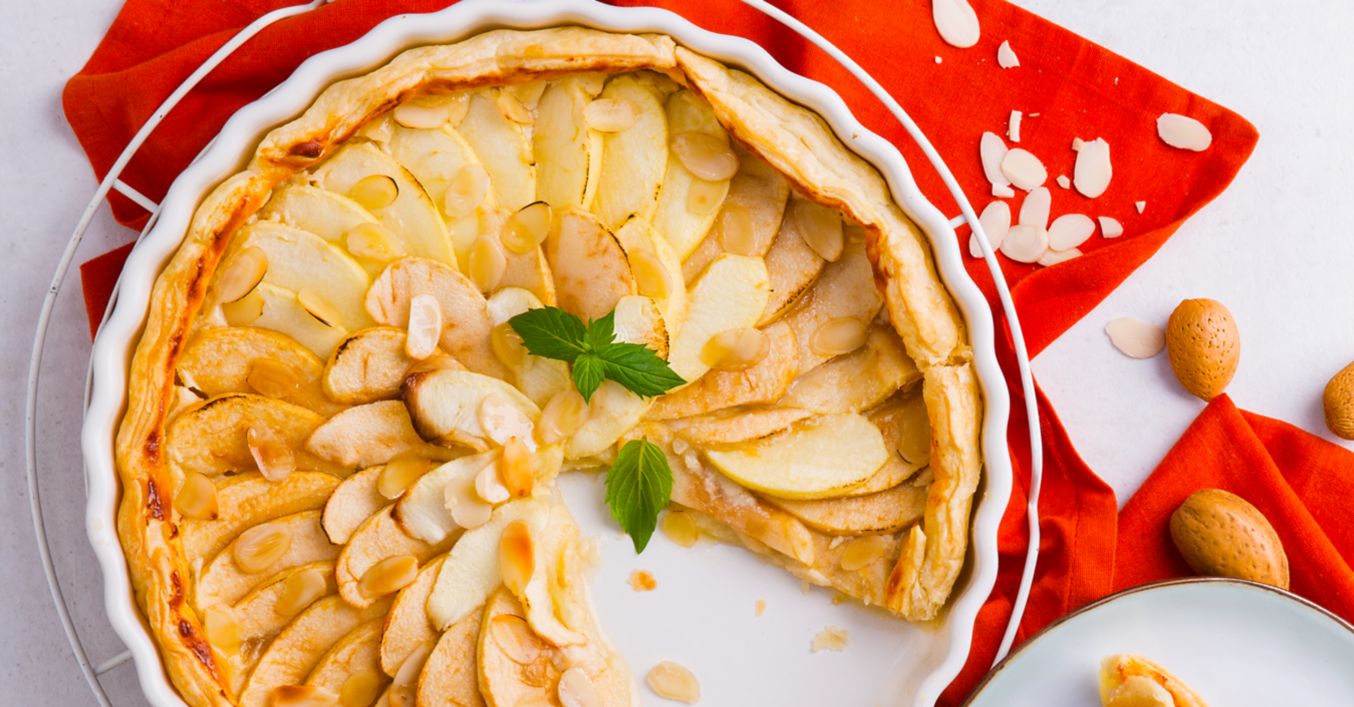 Mandelblättchen überstreuen und die Tarte im vorgeheizten Backofen bei 200 Grad (Umluft: 180 Grad) 25-30 Minuten goldbraun backen.Honig erwärmen, die Tarte damit glasieren und warm oder kalt mit Vanilleeis servieren.