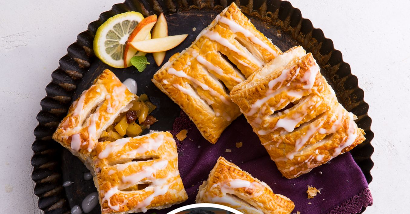 Die Apfelfüllung auf eine Hälfte des Blätterteigs verteilen. Am Rand etwas Platz zum Verschließen lassen. Die andere Hälfte mit einem Messer mittig vier Mal waagerecht einschneiden und umklappen, sodass die Apfeltaschen verschlossen werden können. Das Ei verquirlen und den Rand des Blätterteiges bestreichen. Mit Hilfe einer Gabel alle vier Enden verschließen.