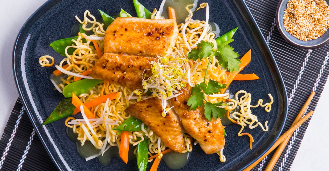 Pangasius waschen und trocken tupfen. Sojasoße, 2 Esslöffel Öl, Sesamsamen und Chiliflocken verrühren und das Fischfilet damit bestreichen. Nudeln in kochendem Salzwasser circa 3 bis 5 Minuten garen, abtropfen lassen, in einem Wok oder einer großen Pfanne in restlichem erhitztem Öl anbraten und herausnehmen.