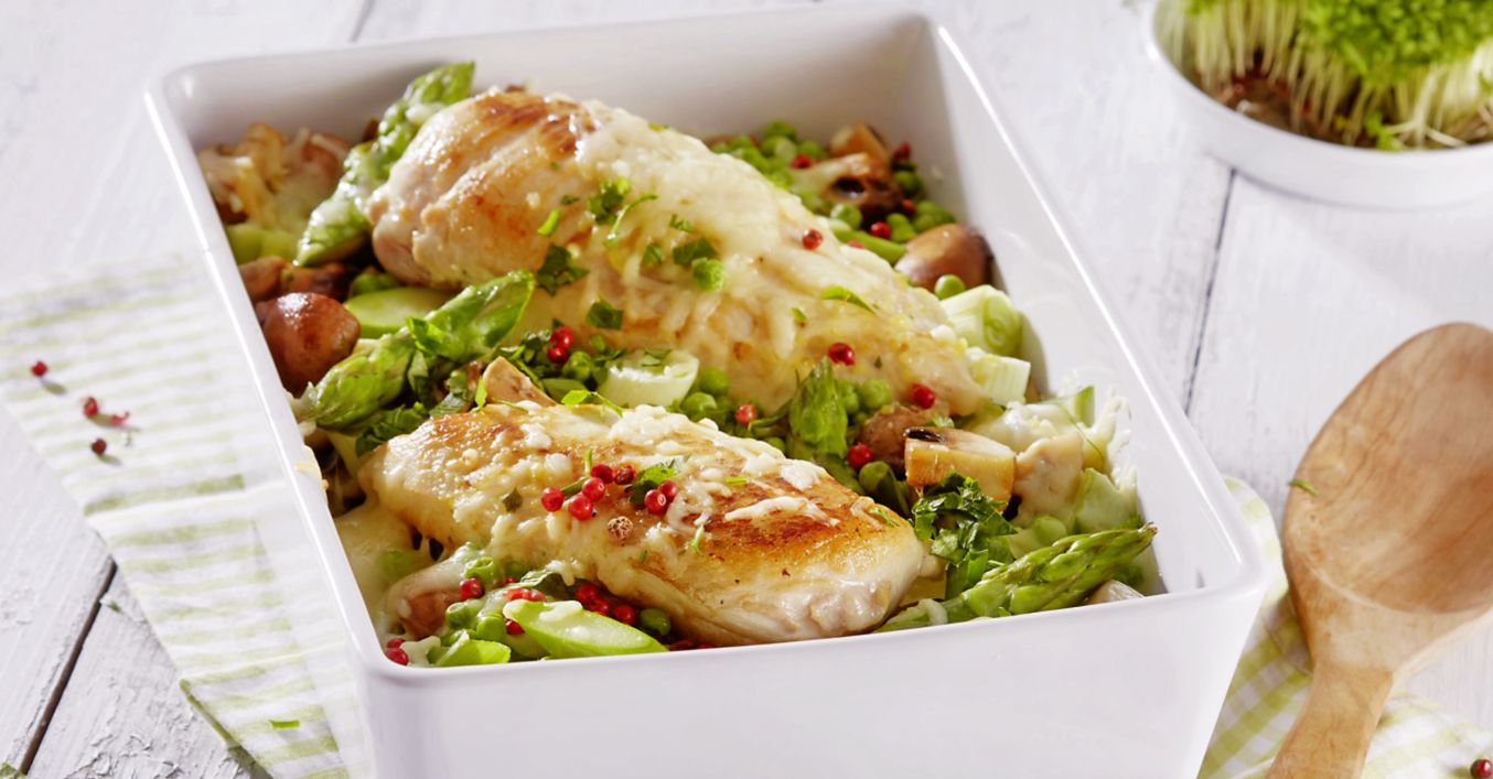 Auflauf mit Frühlingsgemüse und Hähnchenbrustfilet