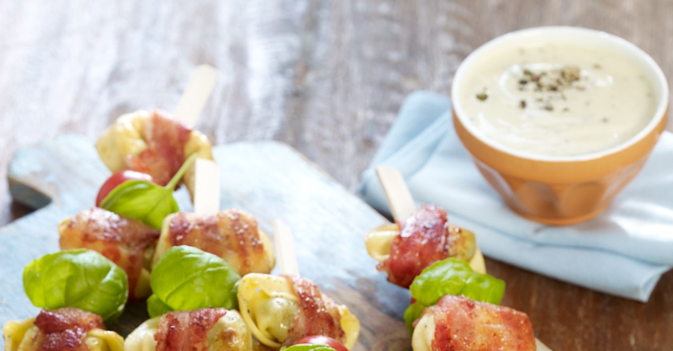 Baconscheiben halbieren, Tortellini damit umwickeln und in erhitztem Öl von allen Seiten circa 5 Minuten braten. Tomaten und Basilikum waschen und mit den Tortellini auf Spieße reihen.