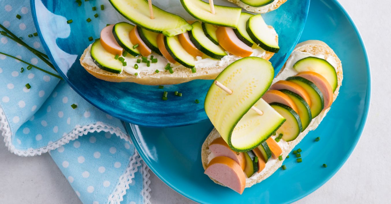 Übrige Gurkenhälfte der Länge nach mit einem Sparschäler in 8 dünne Scheiben schneiden. Die Streifen oben und unten durch Holzspieße stecken, sodass ein Segel entsteht. Spieße senkrecht auf den Brötchenhälften als Segel feststecken und servieren.