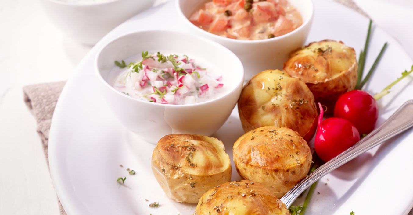 Kartoffeln mit Öl bestreichen, mit Majoran bestreuen und mit den Dips servieren.
