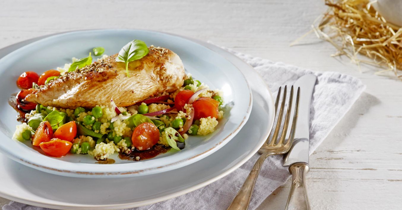 Balsamico-Limetten-Hühnchen mit Erbsen-Basilikum-Couscous