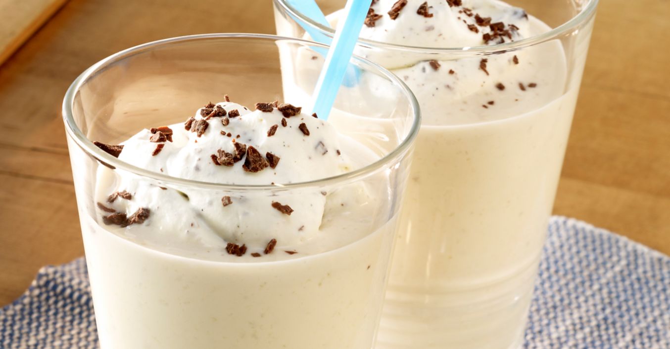 Bananen-Shake in hohe Gläser füllen, mit Schoko-Sahne-Haube garnieren und mit langen Strohhalmen und einem langen Löffel servieren.