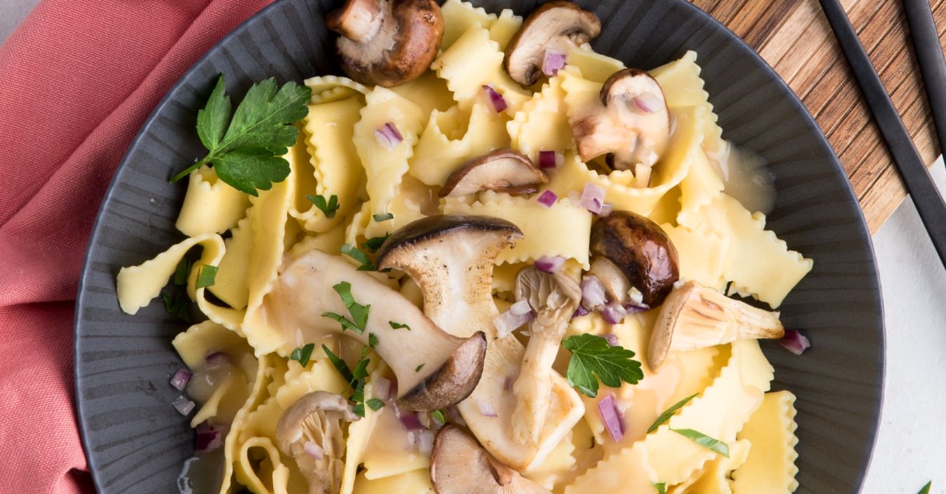 Pasta nach Packungsanleitung kochen. Pilze putzen und in mundgerechte, nicht zu kleine Stücke schneiden, denn sie schrumpfen beim Anbraten. Zwiebeln und Knoblauch ebenfalls hacken.