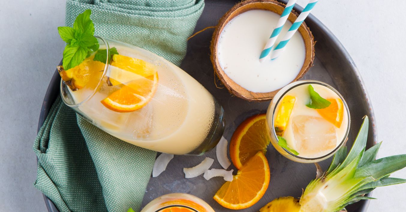 Batida de Coco, Bananennektar und Orangesaft mit Eiswürfeln in einem Cocktailshaker schütteln, in ein Glas abseihen und mit der Orangenscheibe garniert servieren.