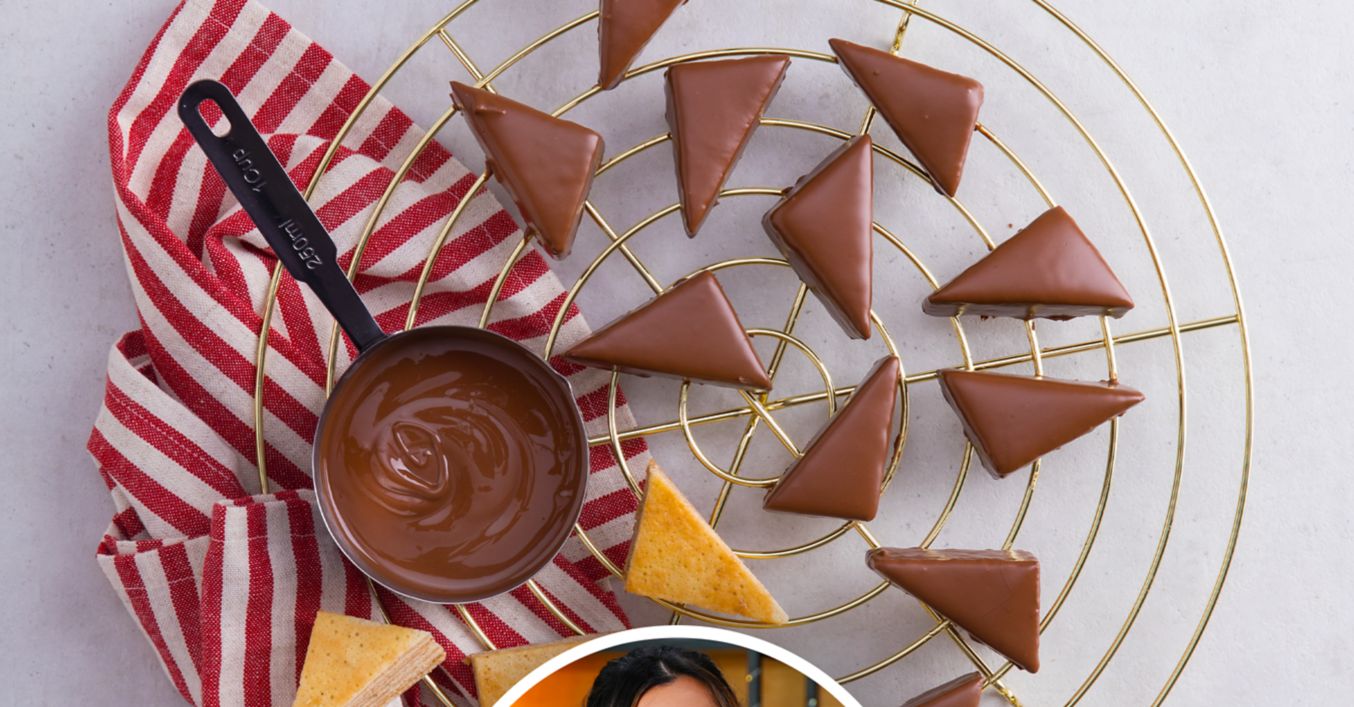 Den Teig nach dem Abkühlen mithilfe eines Backformlösern vom Backrahmen lösen. Den Teig achtmal längs und fünfmal quer durchschneiden. Die 40 Rechtecke nun diagonal schneiden, sodass 80 Dreiecke entstehen.