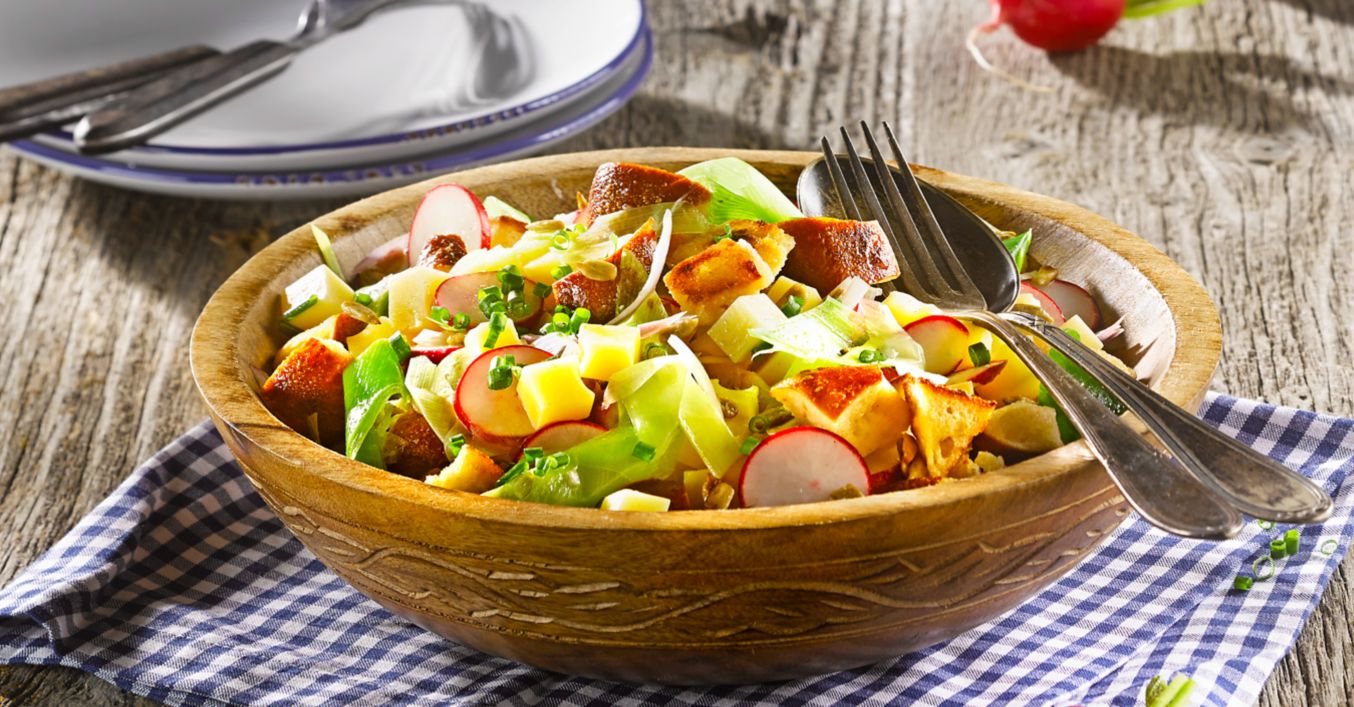 Bayrischer Laugenbrötchensalat mit Bergkäse