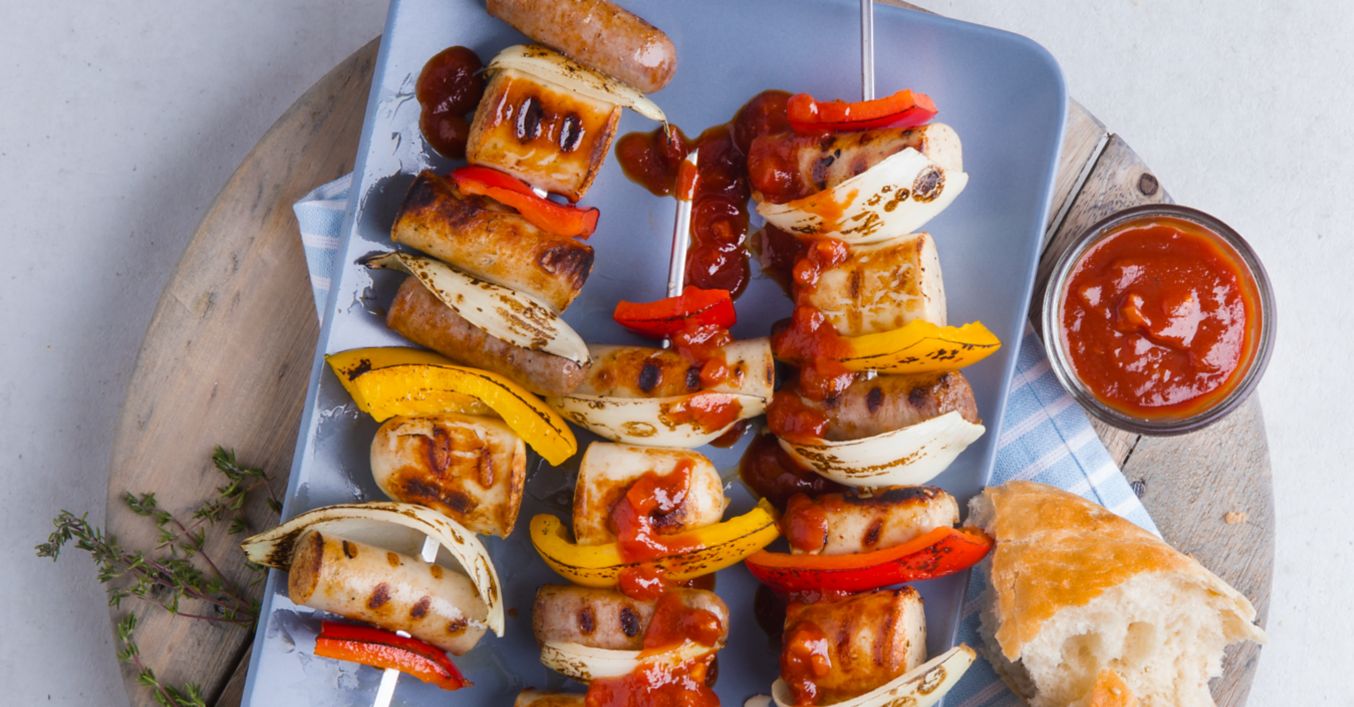Würstchen in grobe Stücke schneiden, Paprikaschoten halbieren, putzen, waschen und grob würfeln. Gemüsezwiebel abziehen und in Stücke schneiden. Würstchen und Gemüse auf Spieße reihen.