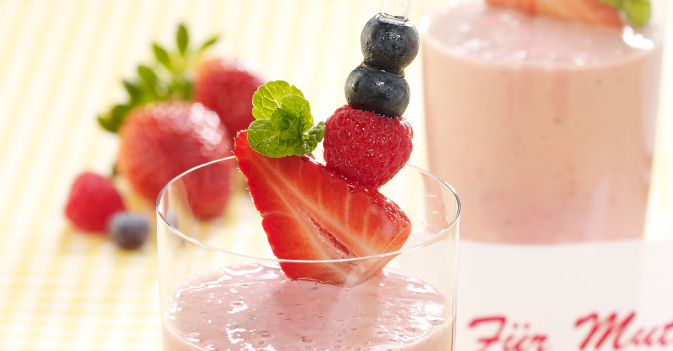 Smoothie in 4 Gläser füllen, die Gläser mit den Beerenspießen dekorieren.