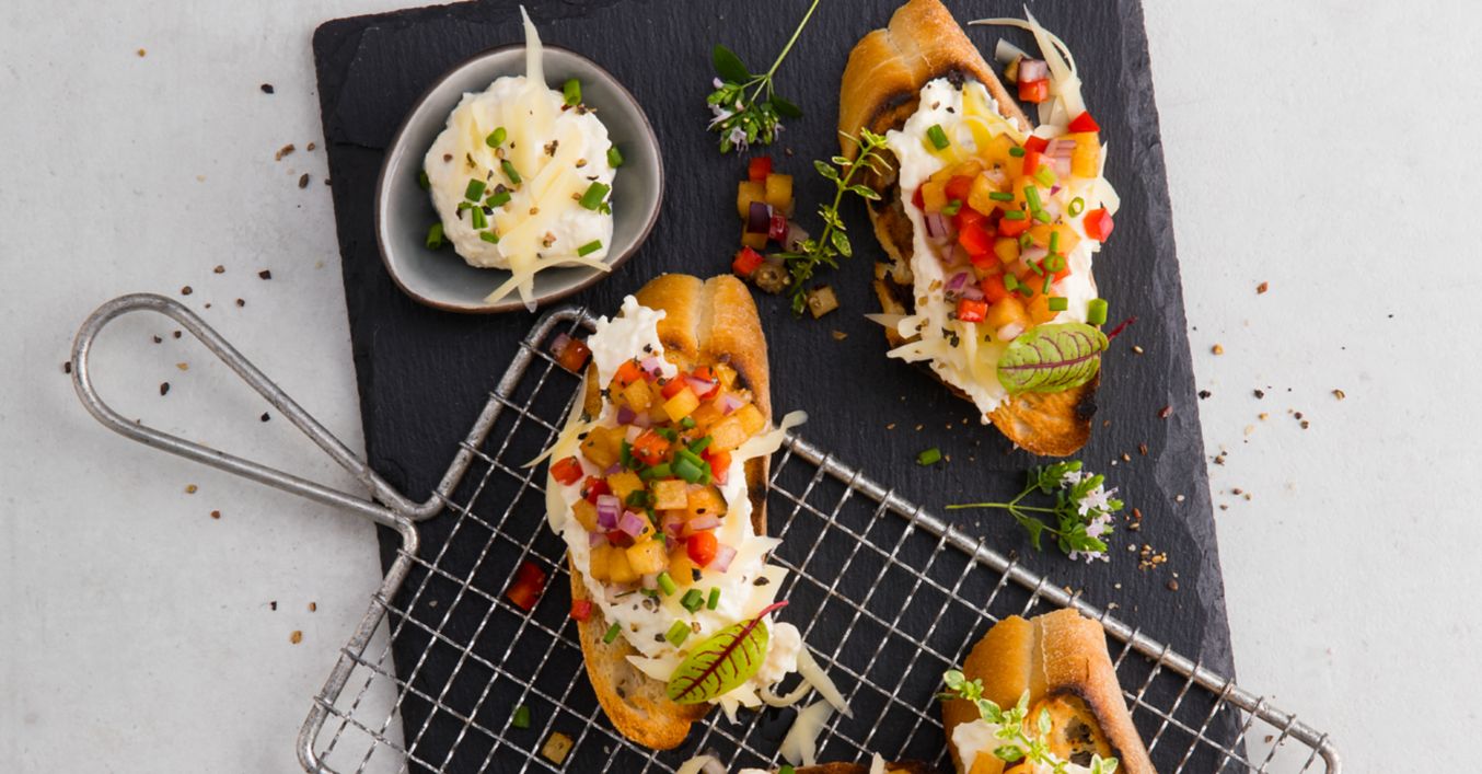 Zum Servieren jeweils etwas Bergkäse-Creme auf die warmen Brotscheiben streichen, einen Löffel der fruchtigen Salsa darübergeben und mit frischen Kräutern garnieren.