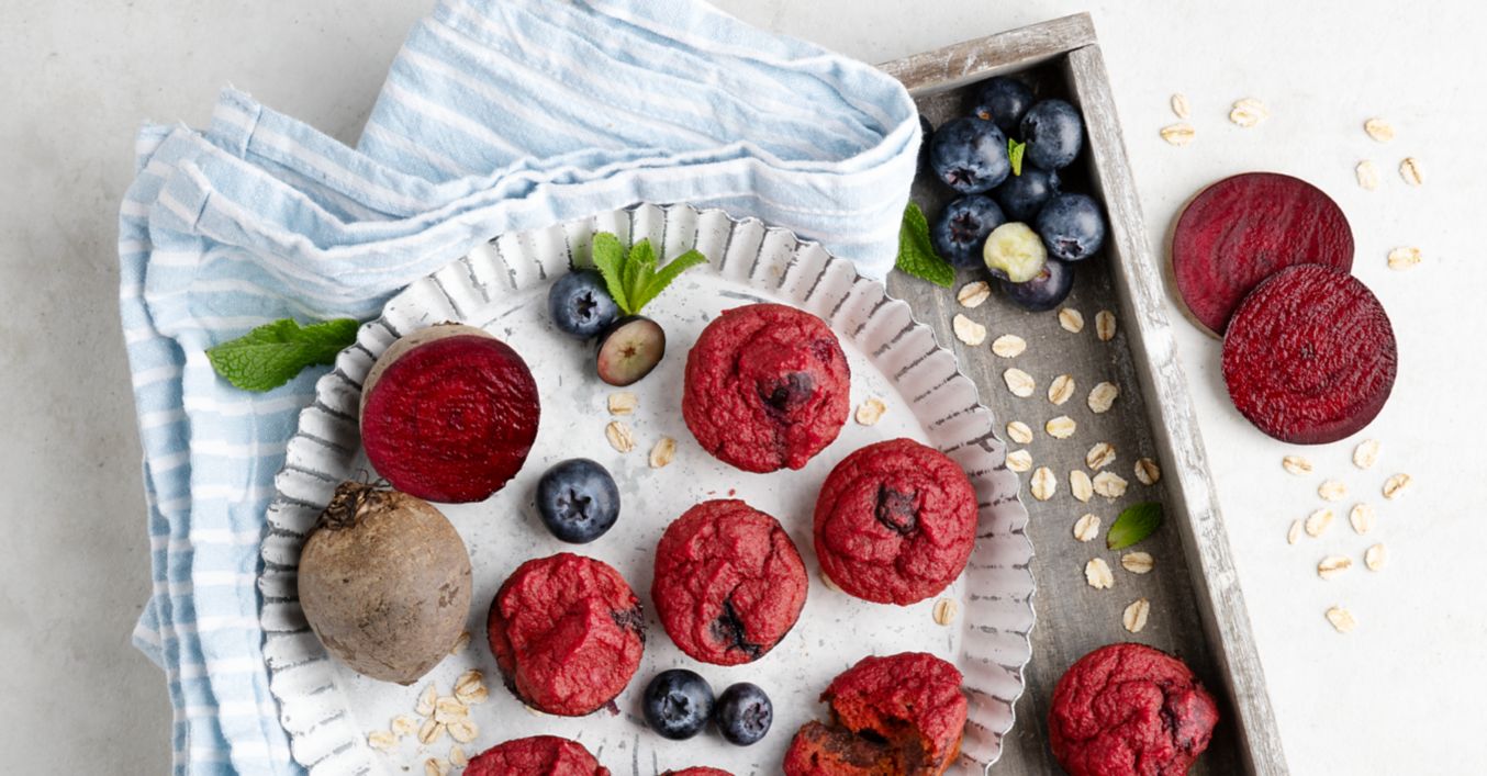 Rote Bete pürieren und mit Mehl, Eiern, Backpulver, Salz und Zitronensaft mit einer Gabel verrühren, zum Schluss Heidelbeeren untermischen.
