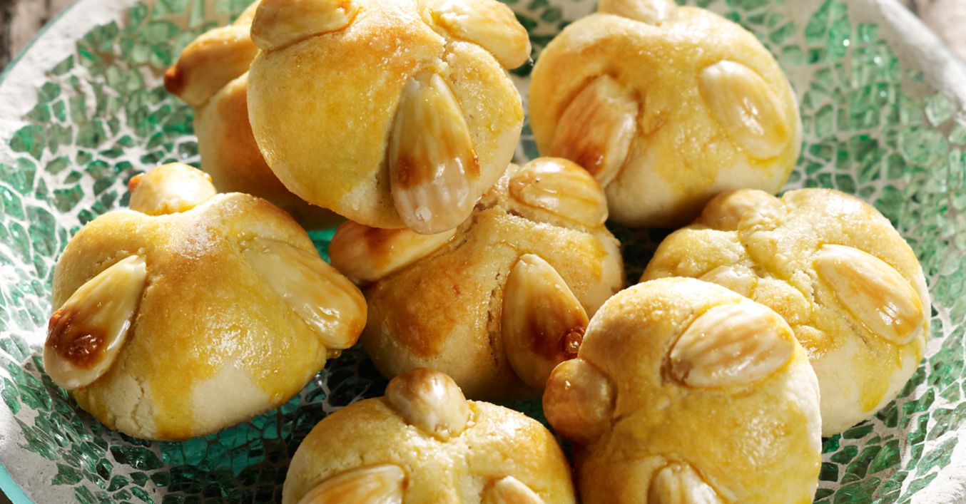 Teig zu einer Rolle formen, in circa 30 Stücke schneiden und zu Kugeln formen. Jeweils 3 Mandeln seitlich an die Kugeln setzen und fest andrücken. Eigelb und Milch verquirlen, die Plätzchen damit bestreichen, auf ein mit Backpapier ausgelegtes Backblech setzen und im vorgeheizten Backofen bei 180 °C (Gas: Stufe 3, Umluft 160 °C) circa 12 bis 15 Minuten goldbraun backen.