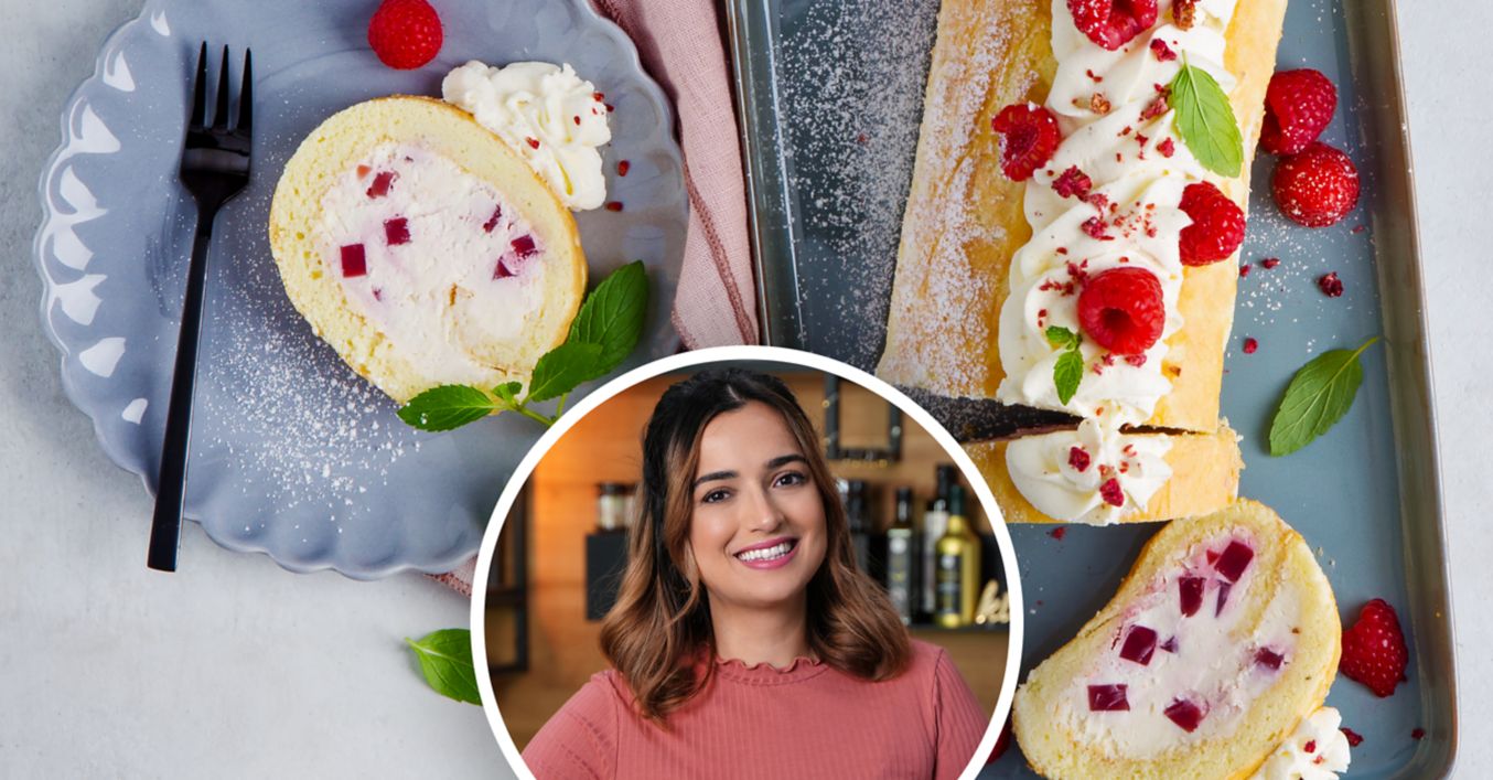 Für die Dekoration die aufgehobene Sahnecreme in einen Spritzbeutel mit Rosentülle füllen und an der Oberfläche entlang aufspritzen. Diese mit Himbeeren, sowie frischer Minze dekorieren. Seiten der Biskuitrolle abschließend mit Puderzucker bestäuben.