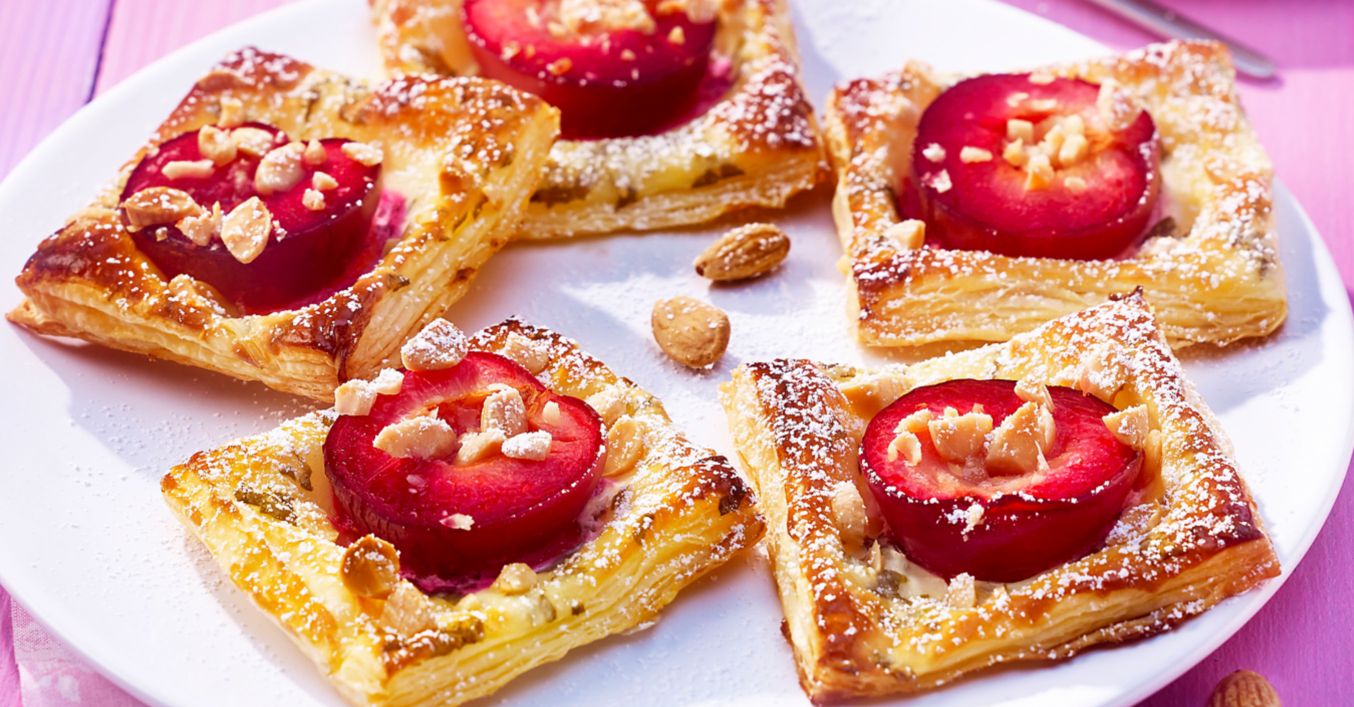 Pflaumenhälften mit der Schnittfläche nach oben auf die Blätterteig-Quadrate legen, mit Mandeln bestreuen und im vorgeheizten Backofen bei Umluft 180 °C (Umluft: 160°C) 20 bis 25 Minuten backen. Blätterteig-Pflaumen nach Wunsch noch warm mit Vanilleeis servieren.