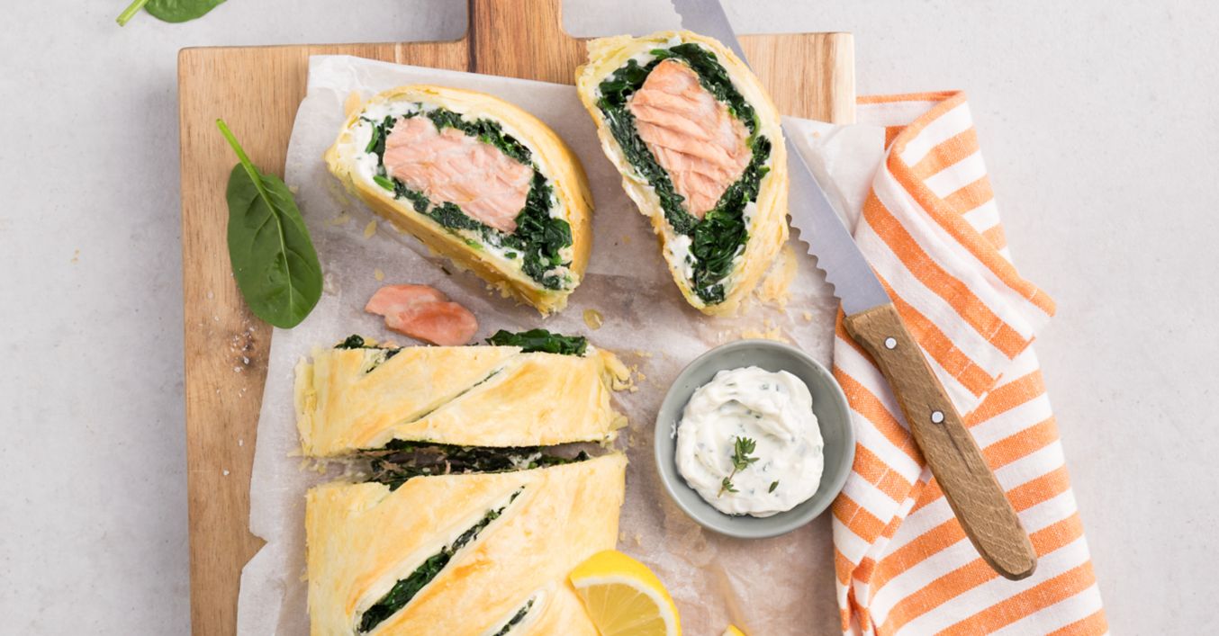 Blätterteig auf einem Backblech ausrollen und mit Kräuterfrischkäse bestreichen. Spinat auf den Frischkäse verteilen, mit Salz, Pfeffer und Muskatnuss würzen, Lachsfilet in die Mitte legen und abschließend mit Käse bestreuen.