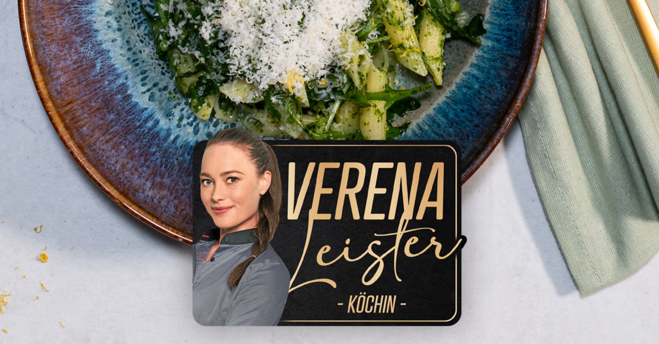 Nudeln, Saft und Abrieb der Zitronen sowie Rucola und Pesto untermischen und kurz mit erhitzen.