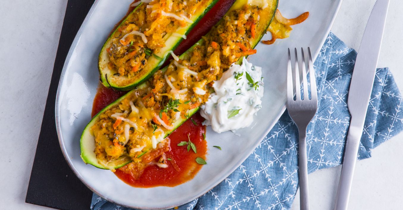 Zucchinihälften mit der Bratlingmischung füllen und in die Tomatensauce setzen (gegebenenfalls zwei Auflaufformen verwenden). Mit Käse bestreuen und etwa 25 bis 30 Minuten backen.