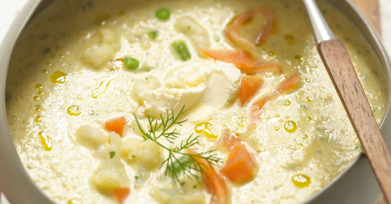 Blumenkohlröschen und Brühe zugeben und circa 15 Minuten garen. Suppe pürieren. Wildlachsstreifen zufügen und Suppe einmal aufkochen.