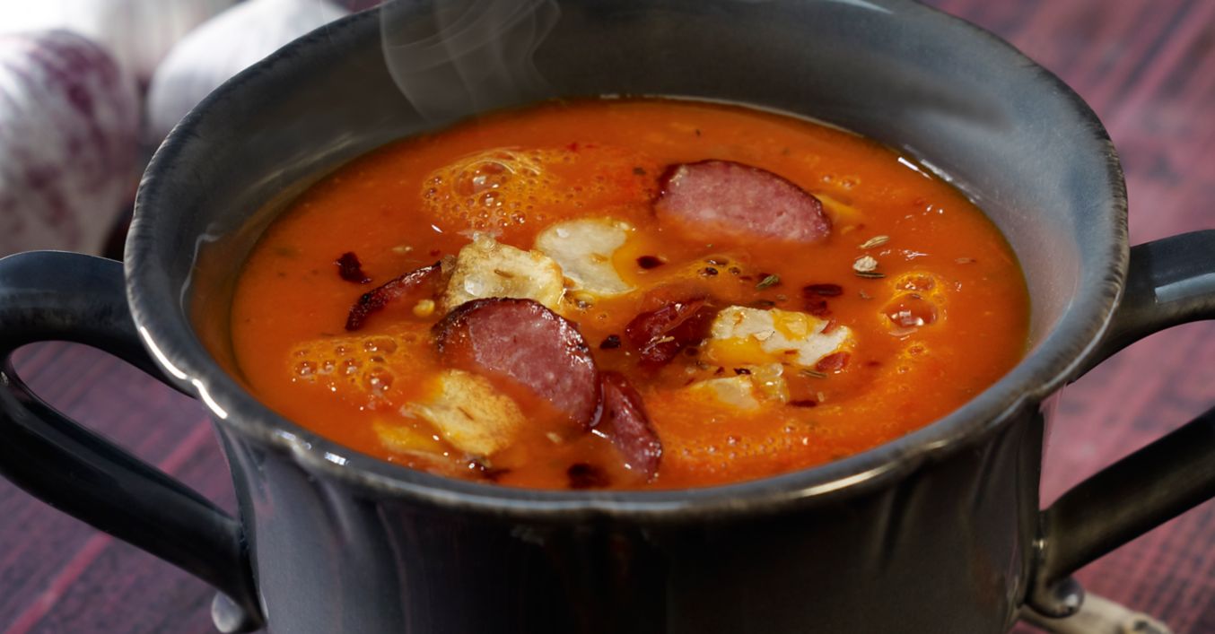 Kabanossi in Scheiben schneiden und im restlichen erhitzten Öl knusprig braten. Suppe pürieren, mit Salz und Pfeffer abschmecken, in Tassen oder Teller füllen und mit einer Einlage aus Kabanossi und einem Topping aus Knoblauchchips servieren.