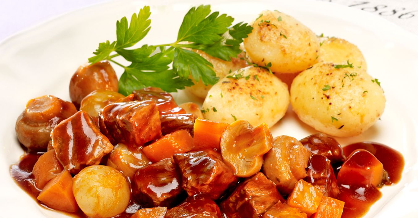 Kräuterstrauß entfernen. Zum Schluss die Soße mit Soßenbinder andicken, mit Salz und Pfeffer abschmecken und mit den Kartoffeln servieren.
