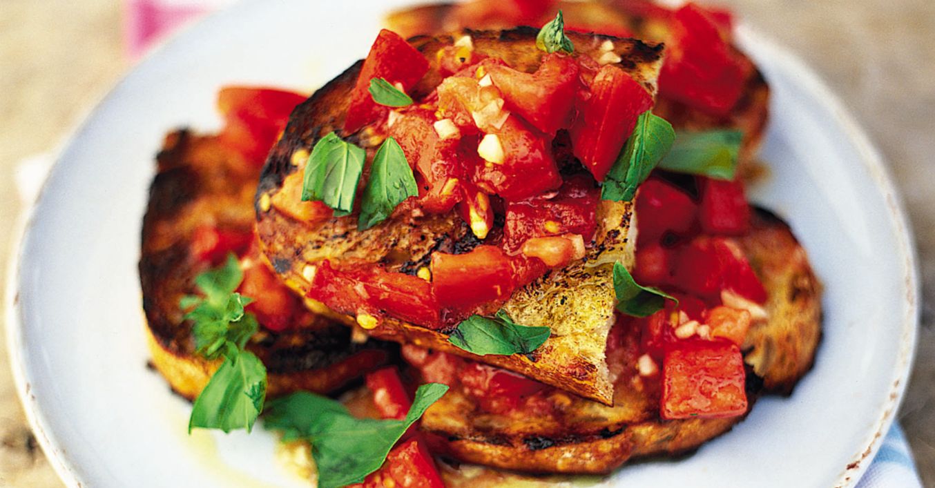 Das Brot auf dem Grill rösten und mit einer Knoblauchzehe einreiben. Mit Olivenöl beträufeln und mit den Tomaten belegen. Mit gerupften Basilikumblättern bestreuen und reinbeißen – der Sommer ist da!