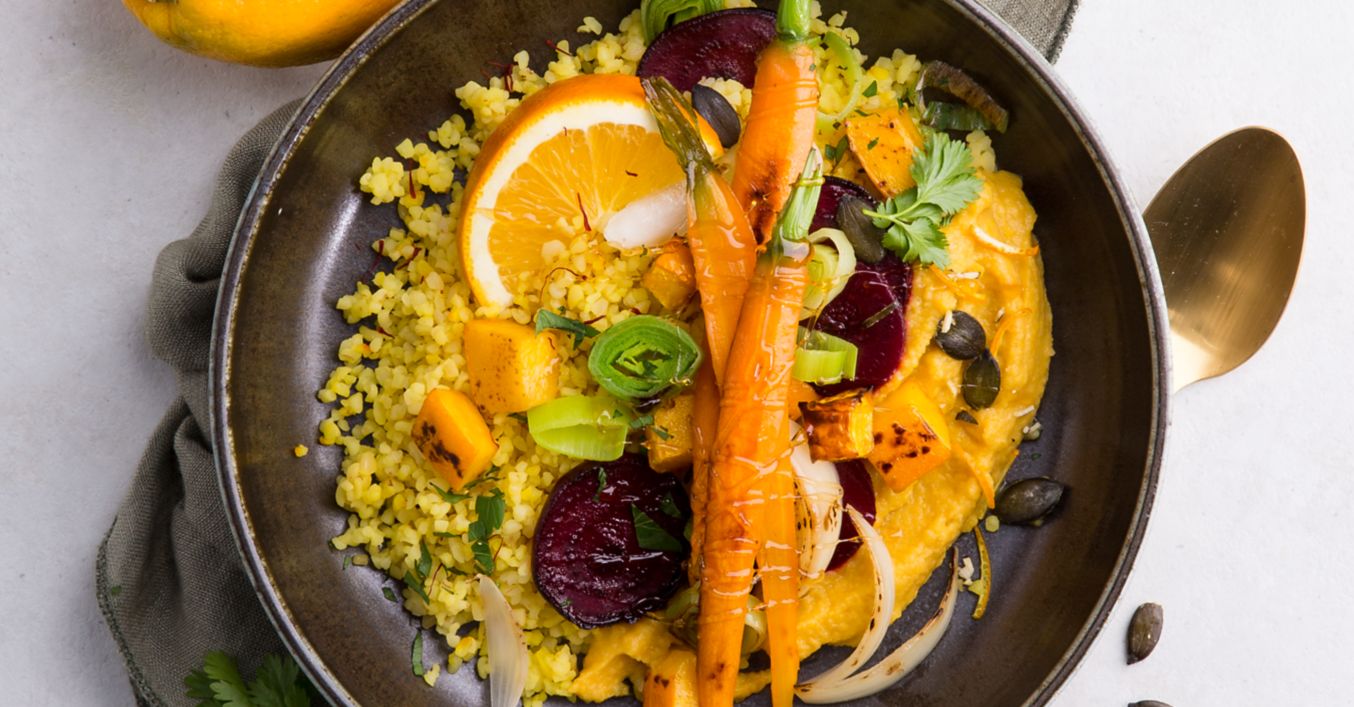 Bulgur mit gebackenem Gemüse und Kürbis-Hummus
