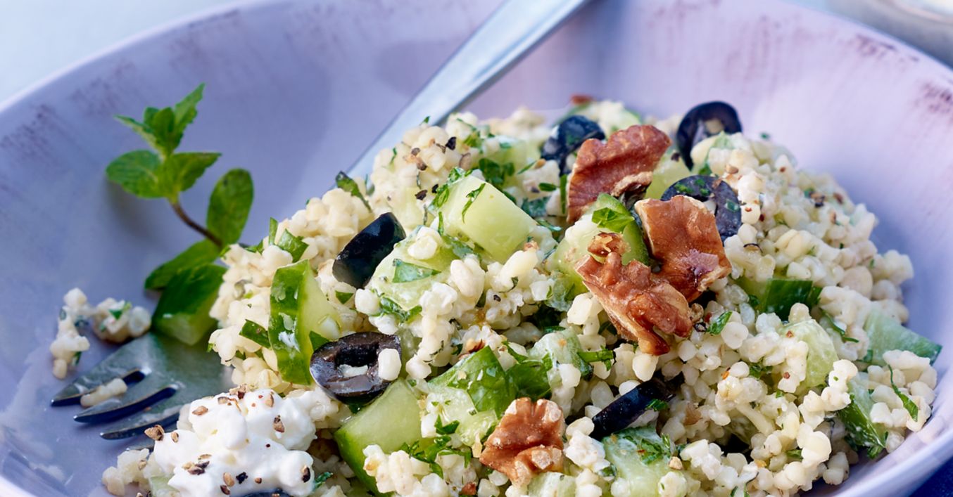 Für das Dressing Knoblauch abziehen und zerdrücken. Joghurt mit Kräutern, Knoblauch verrühren und mit Zucker, Salz und Pfeffer würzen. Bulgur mit Dressing, Gurke und Oliven vermischen und circa 30 Minuten ziehen lassen.