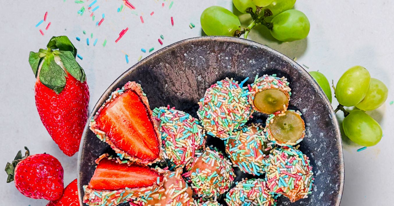 Die mit Gummibärchen ummantelten Früchte in die geschmolzene Schokolade tauchen und abtropfen lassen. Danach Zuckerstreusel über die noch flüssige Schokoschicht streuen.