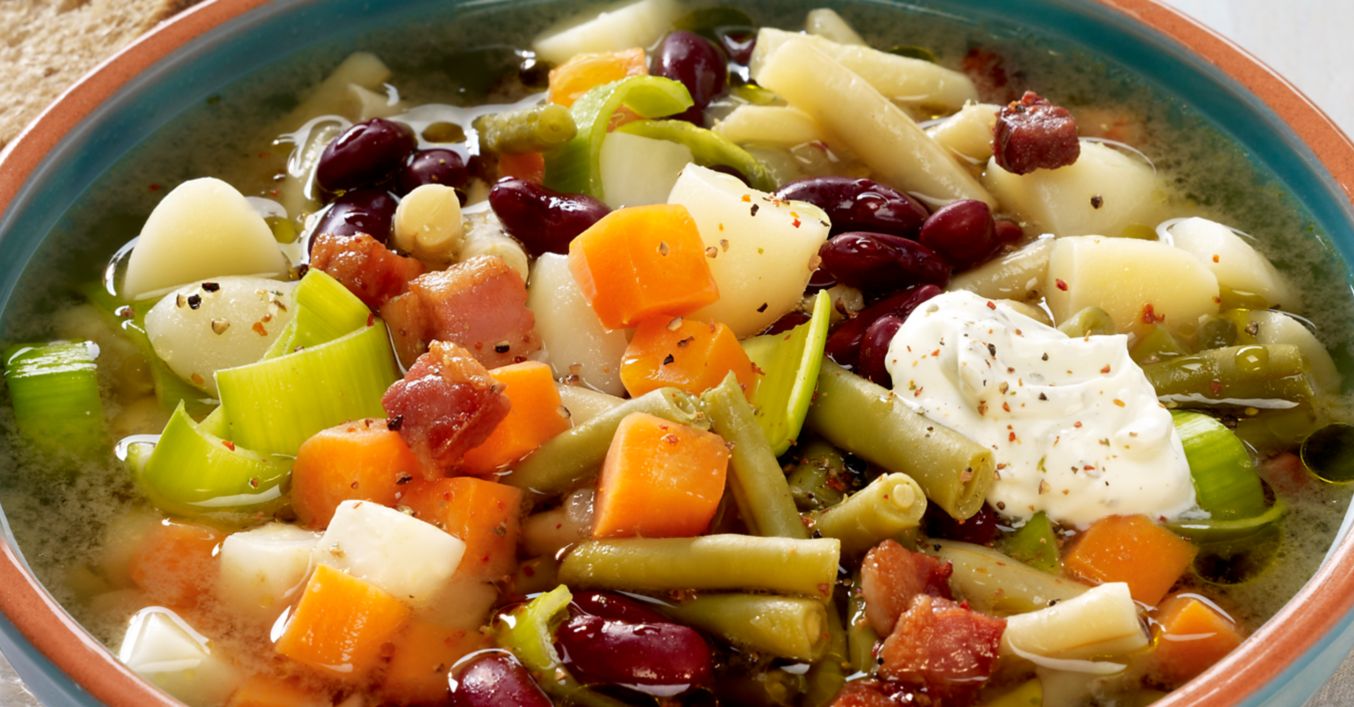 Bohnen und Kartoffeln dazugeben und circa 5 Minuten mit erhitzen. Eintopf mit Bohnenkrautblättchen verfeinern und mit Salz, Pfeffer und Muskat abschmecken. In Teller oder Suppentassen füllen, mit Schmandtupfen garnieren und servieren. Dazu schmeckt frisches Bauernbrot.