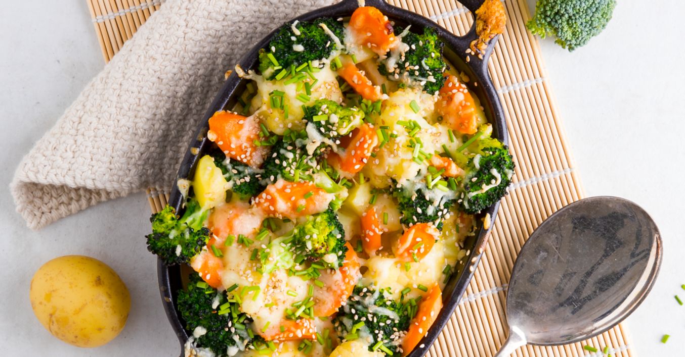 Kartoffelstücke mit Gemüse in einer Auflaufform mischen. Eier mit Milch und Sahne verquirlen. Mit Schnittlauchringen, Muskatnuss, Salz und Pfeffer würzen und über den Auflauf geben. Mit Käse und Sesam bestreuen. Gemüseauflauf im vorgeheizten Backofen bei 180 °C (Umluft: 160 °C) circa 30 bis 35 Minuten backen und servieren.