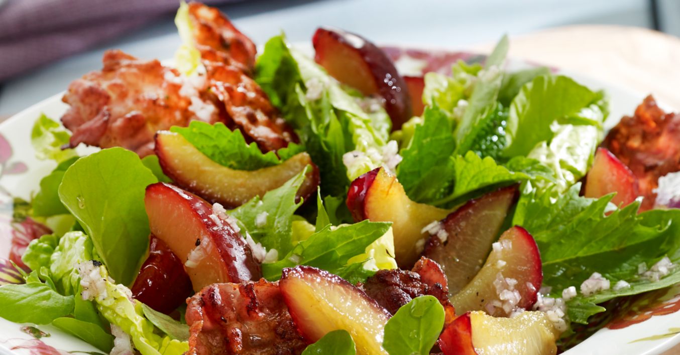 Bunter Salat mit karamellisierten Zwetschgen und Baconchips