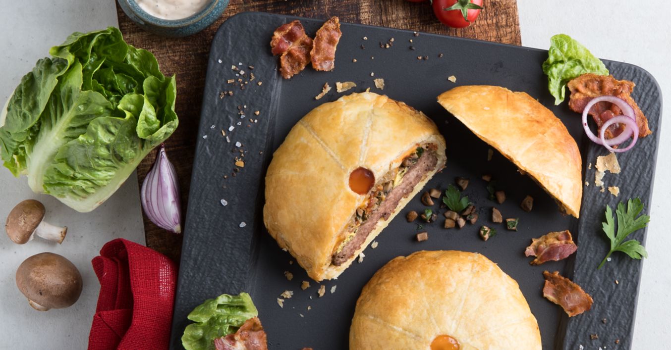 Burger Patties bei hoher Temperatur in erhitztem Öl von beiden Seiten kurz anbraten. Backofen auf 180 Grad Umluft (200 Grad Ober-/ Unterhitze) vorheizen und ein Backblech mit Backpapier auslegen. Blätterteige ausrollen und mit einem runden Ausstecher kleine 4 Kreise (Durchmesser circa 12 Zentimeter) und 4 große Kreise (Durchmesser circa 15 Zentimeter) ausstechen. Eigelb mit Milch verquirlen und salzen.Die kleinen Blätterteig-Kreise auf dem Backblech verteilen und mit den Patties belegen. Mit jeweils 1 Teelöffel Senf bestreichen, Pilze, Speck und Zwiebeln darauf verteilen, je 1 Sandwichscheibe auflegen und etwas andrücken. Mit einem kleinen Ausstecher jeweils mittig ein Loch aus den großen Blätterteig-Kreisen ausstechen und mit dem Messerrücken einritzen. Blätterteig-Kreise auflegen, die Ränder gut verschließen, mit der Eigelb-Milch bestreichen und im vorgeheizten Backofen 25 bis 30 Minuten goldgelb backen.