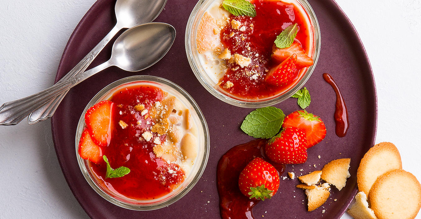 Pannacotta aus dem Kühlschrank nehmen, mit Fruchtikus und Minze garnieren und servieren.